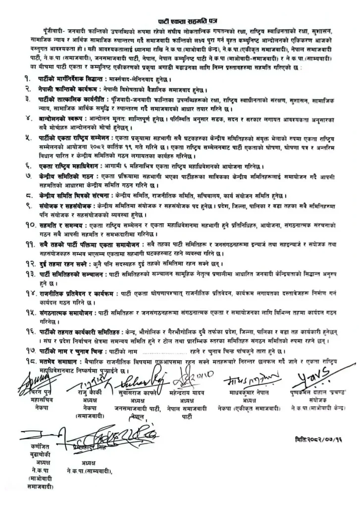 नेपालको राजनीतिक वृत्तमा ठूलो पुनर्संरचना हुने संकेत देखिएको छ। नेकपा (माओवादी केन्द्र) र नेकपा (एकीकृत समाजवादी) सहित आठ वामपन्थी दलहरूबीच १८ बुँदे सहमति पत्रमा हस्ताक्षर गरिएको छ।